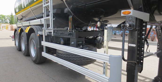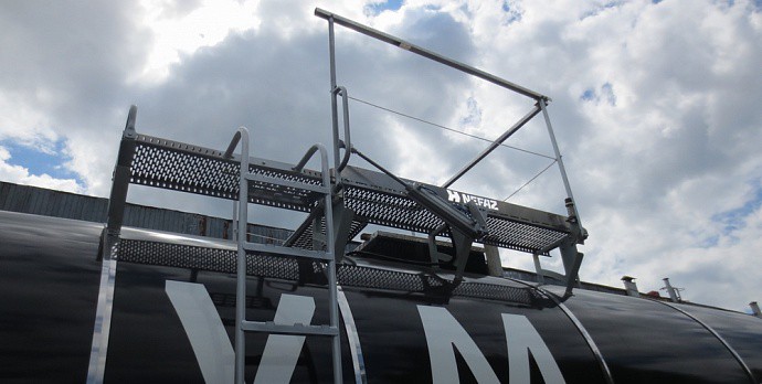 Для исключения пролива перевозимого продукта на землю в верхней части ППЦ выполнен экологический короб с закрывающейся крышкой из просеченного алюминиевого сплава. Слив пролитого продукта из короба осуществляется по трубопроводам с запорной арматурой на концах. По периметру короба установлены площадки из просеченного алюминия для исключения скольжения и складной поручень для обеспечения безопасности работы оператора сверху цистерны. Складной поручень приводиться в рабочее положение с уровня земли пневматическими цилиндрами. Лестница расположена справа по ходу движения.