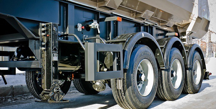 Подвеска полуприцепа - пневматическая, на шести пневмобаллонах, с шестью гидравлическими амортизаторами, регулятором положения кузова и подъемной передней осью.