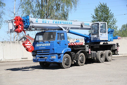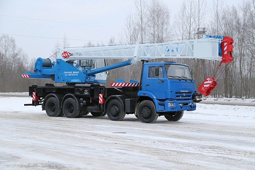 Автомобильный кран КС-55729-1B грузоподъемностью 32 тонны на шасси автомобиля КАМАЗ-6540 предназначен для производства строительно-монтажных и погрузочно-разгрузочных работ на рассредоточенных объектах.