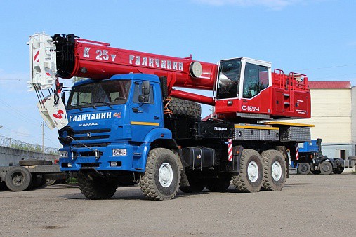 Кран стреловой автомобильный КС-55731-4 грузоподъемностью 25 тонн монтируется на шасси автомобилей KAMAZ-65222. Предназначен для погрузочно-разгрузочных и строительно-монтажных работ на рассредоточенных объектах. Шасси обладает отличной маневренностью, и легкостью управления, что позволяет использовать кран на объектах с различными типами подъездных путей, а малые габариты делают его пригодным для эксплуатации в стесненных условиях современных городов.