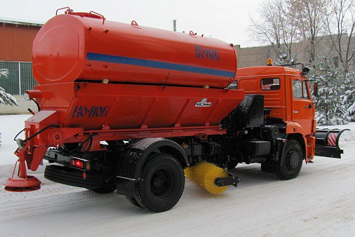 Машина комбинированная КО-806 предназначена для поливки и мойки дорожного полотна, отбойного бруса и дорожных знаков струями воды под высоким давлением, а также для сметания мелкого мусора с асфальтобетонных покрытий в летний период и для патрульной снегоочистки, удаления наледи распределением противогололедных материалов и химических реагентов в зимний период.