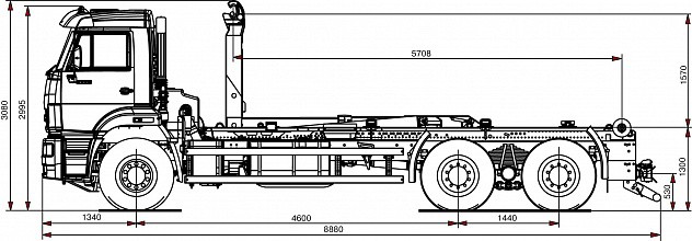 Автомобиль 658667-0030-00 с крюковым погрузчиком PALFINGER PALIFT ST20-6000 предназначен для интенсивных транспортных работ с использованием сменных кузовов DIN 30722-1, 2 класса длиной от 4250 до 6500 мм, полной массой до 17,83 тонн.