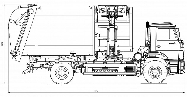В состав специального оборудования входят: кузов с задней крышкой, толкающая плита, боковой манипулятор, гидравлическая и электрическая системы. Загрузка отходов в кузов производится из контейнера боковым манипулятором. Уплотнение отходов в кузове производится толкающей плитой. Выгрузка осуществляется опрокидыванием кузова и толкающей плитой.
