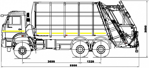 Уплотняет отходы с коэффициентом до 1:7 и вмещает в себя около 120 куб.м. неуплотненных отходов или содержимое 110 евробаков объемом 1,1 куб.м. или 12 бункеров объемом 8 куб.м.